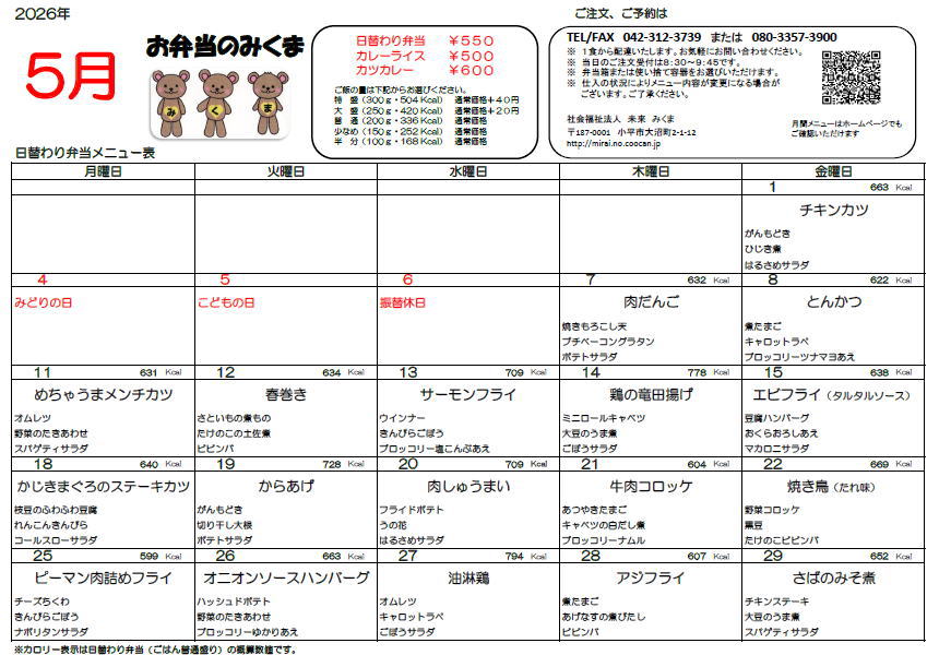 【2026年5月メニュー表】